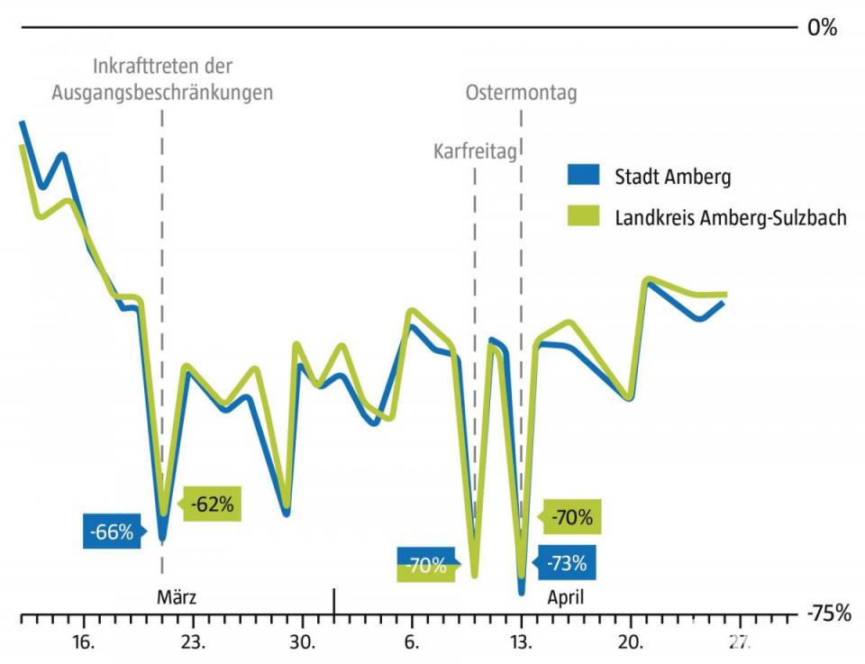 Täglich werden anonymisierte Mobilfunkdaten gewonnen und daraus anonymisierte und aggregierte Bewegungsströme dargestellt. Dr. Roland Brey, der Leiter des Amberger Gesundheitsamtes, hat sich die Daten für den Landkreis Amberg-Sulzbach und die Stadt Amberg angeschaut. Die Zahlen stellen den prozentualen Rückgang an einem Tag zu den üblicherweise zu erwartenden Werten für den jeweiligen Wochentag dar und beantworten somit die Frage: Wie viel weniger sind Leute unterwegs?