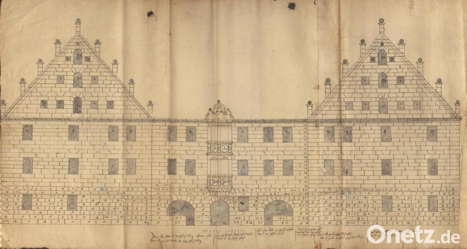 Besonders bemerkenswert ist seinen Aussagen zufolge die Darstellungsweise des Gebäudes auf dieser Zeichnung: Die beiden Giebelseiten wurden zeichnerisch aufgeklappt und flankieren die Fassade zur heutigen Regierungsstraße. Eingezeichnet sind im unteren Gebäudeteil sowie in den Türen und Fenstern die Längenangaben in Schuh, einem früher in vielen Teilen der Welt verwendeten Längenmaß. Diese hatte Ortenberger außerdem am Rande des Plans zusammengerechnet.