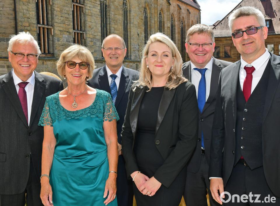 Der bisherige Leiter der Justizvollzugsanstalt, Peter Möbius (links), ist seit 31. März im Ruhestand. Sein Nachfolger Wilfried Schmalzbauer (rechts) hat zum 1. April übernommen. Mit auf dem Bild: Ministerialdirektor Franz Arloth (Dritter von links) und Oberbürgermeister Michael Cerny (Zweiter von rechts) sowie die beiden Ehefrauen, Margret Möbius (Zweite von links) und Katharina Schmalzbauer.