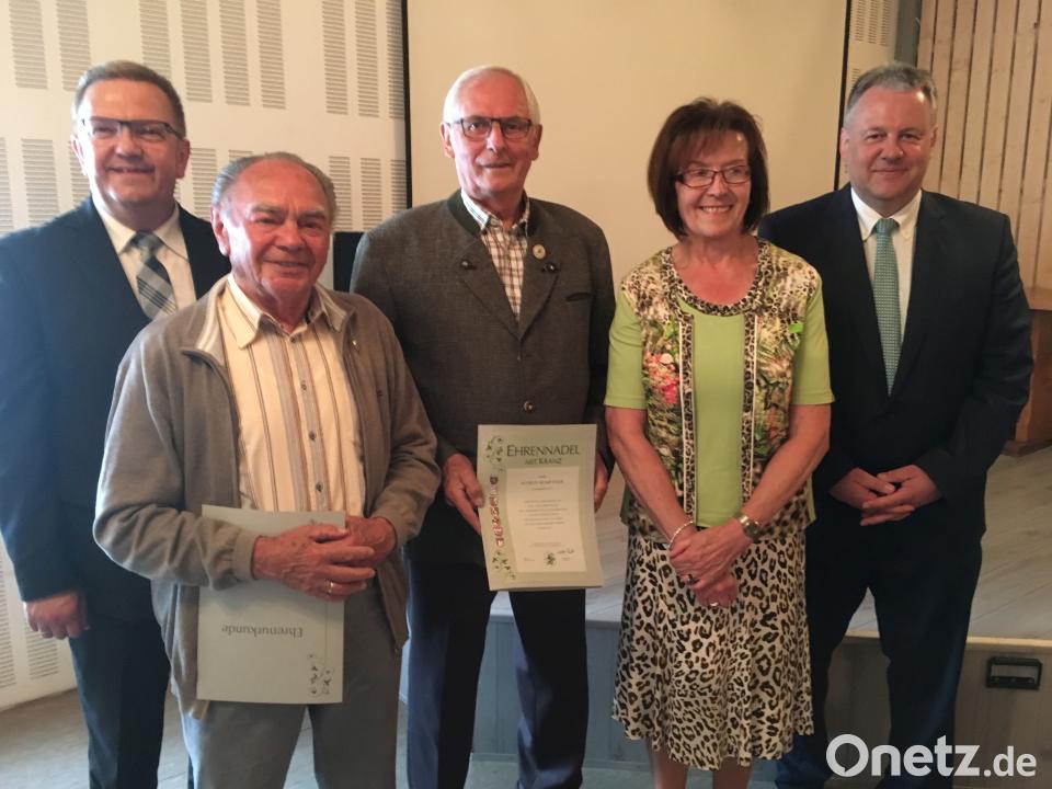(exb) Mit Bürgermeister Martin Preuß zeichnete Landrat Richard Reisinger in seiner Funktion als Kreisvorsitzender der Obst- und Gartenbauvereine Alfred Kemptner und Josef Kölbl jeweils mit einer Ehrennadel mit Kranz aus.