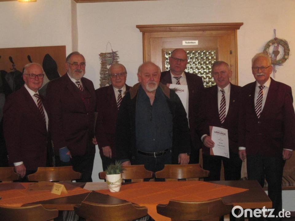 Vorsitzender Ernst ehrte sechs Jubilare für je 25 Jahre Vereinstreue mit einer Dankurkunde: Hans Gurdan, Josef Haller, Jürgen Hiltl, Hans Koller, Hans Pickelmann, Gerhard Schuller. Hans Gurdan und Jürgen Hiltl. Sie wurden zudem vom Sängergruppenvorsitzenden Adolf Gassner für 25 Jahre Singen im Chor mit Urkunde und Ehrennadel des Fränkischen Sängerbundes ausgezeichnet.