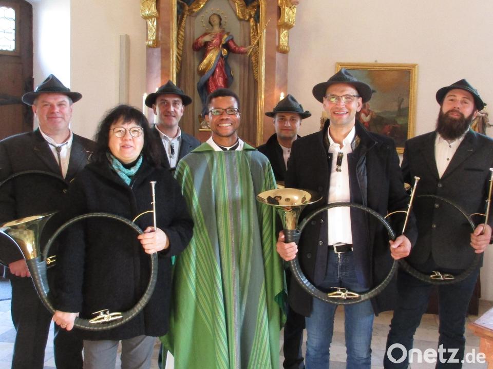 Unter der Leitung von Hornmeister Ely Eibisch brachten sie Stücke aus der Hubertusmesse von Reinhold Stief zur Aufführung. Außerdem spielten sie das "Sanctuslied" ("Heilig") aus der Deutschen Messe von Franz Schubert und das Gotteslob-Lied "Nun danket all und bringet Ehr". Beim Schlusslied "Großer Gott wir loben dich" sangen alle kräftig mit. Zum Auszug intonierten die sieben Bläser noch den "Fürstenruf".