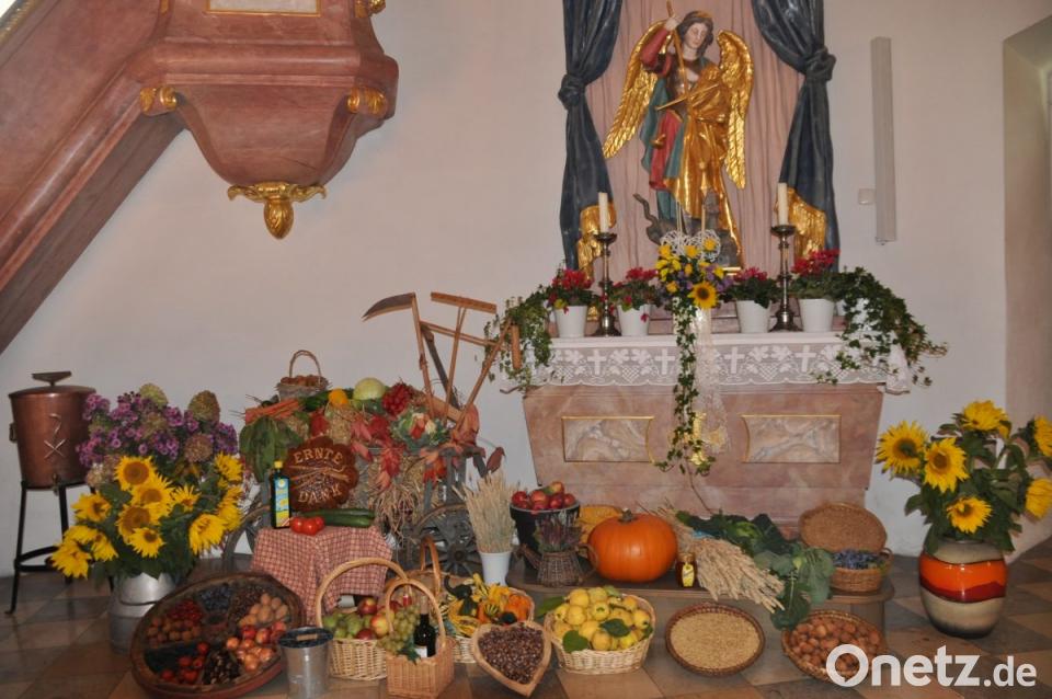 Die Besucher der Dreifaltigkeitskirche auf dem Armesberg konnten zum Erntedankfest einen mit viel Liebe zum Detail erstellten Erntedankaltar bewundern. Erneut zeichneten Marga Hecht und Alois Müller aus Kulmain für den Kirchenschmuck zum Erntedanksonntag in der Wallfahrtskirche verantwortlich. Vorne und beidseits des Seitenaltars schmücken ihn Früchte dieses Erntejahres.