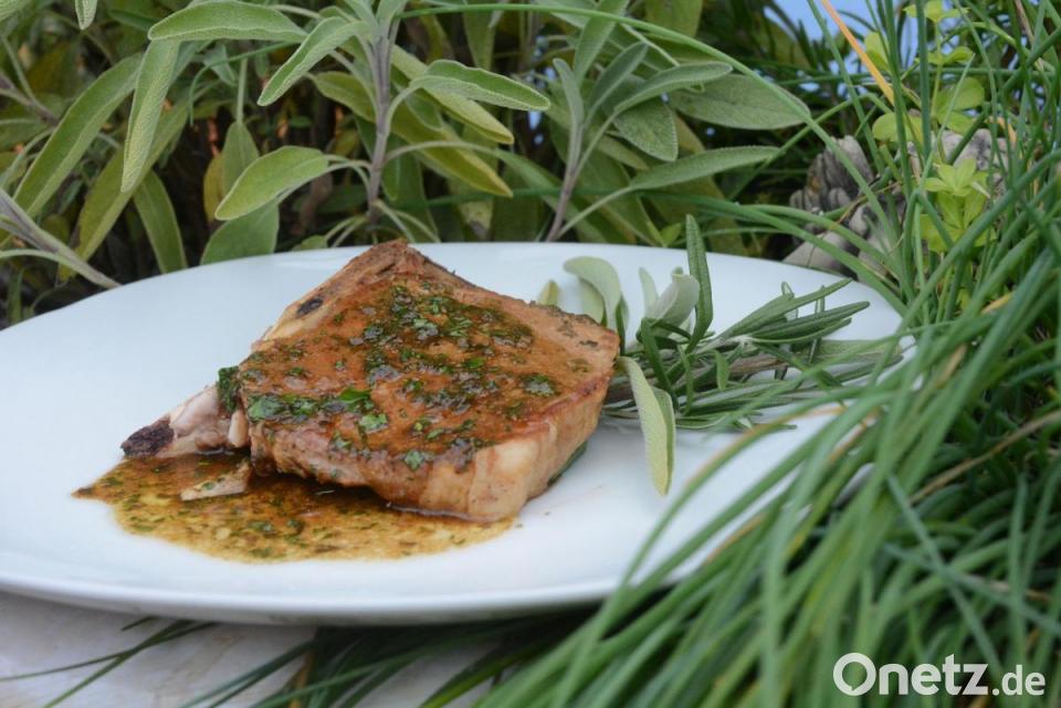 Alles Fett in der Pfanne abgießen bis auf eine dünne Schicht am Boden. 1/2 Tasse Wein hinzufügen und aufkochen lassen. Das Fleisch wieder in die Pfanne geben, zudecken und die Hitze stark reduzieren. Gelegentlich mit dem Bratensaft aus der Pfanne begießen und die Koteletts 25 bis 30 Minuten ziehen lassen, beziehungsweise bis sie weich sind. "Das kann man mit der Messerspitze prüfen", so Schiffer.
