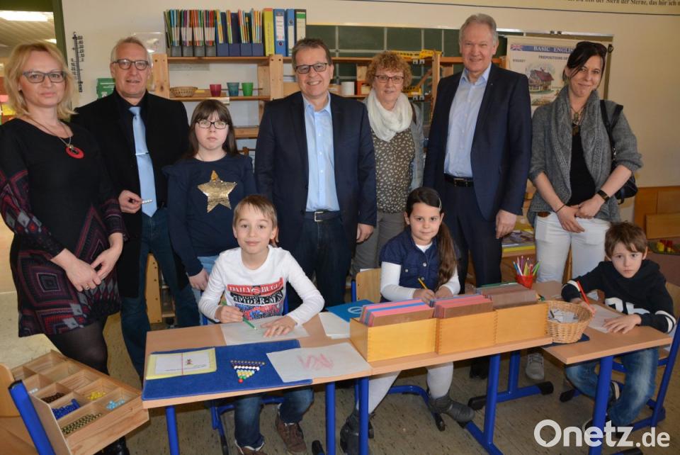 Tag der offenen Tür an der privaten Montessori-Schule in Arzberg: Die aktuell 34 Schüler kommen aus den Landkreisen Wunsiedel und Tirschenreuth. Schulleiterin Petra Hlavacova (links) konnte unter den Gästen auch Landrat Karl Döhler (Zweiter von rechts), Bürgermeister Stefan Göcking (Zweiter von links) und Schulamtsdirektor Günter Tauber (Vierter von links) begrüßen.