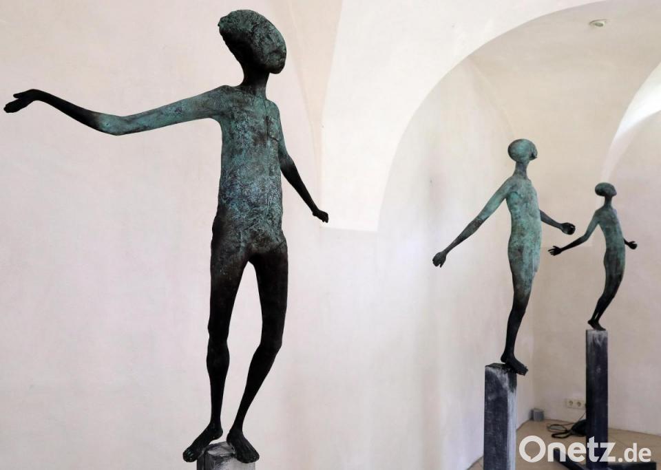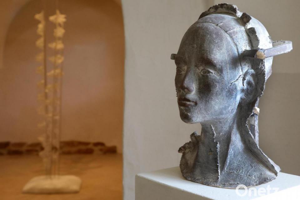 Hanna Regina Uber und Robert Diem haben aus ihrem Oeuvre eine Mischung aus älteren Skulpturen, Bronzeguss, und einigen ganz neuen Arbeiten ausgesucht. Zu Letzteren gehören zwei große Installationen, die starken Bezug zur aktuellen Welt-Lage erspüren lassen. "Tense", der an einer gebogenen Metallstrebe baumelnde organische Körper aus Wachs und Gips, zeigt: Die Lage ist gespannt. "Es geht stark um Balance, um Empfindlichkeit", sagt Uber, aber auch darum, dass die Welt früher nicht so leicht aus der Bahn zu bringen war, wie es gerade der Fall ist. "Ein Gefühl, dass man vorsichtig sein muss", weil die vermeintliche Balance doch nicht so stabil ist, wie es auf den ersten Blick scheint.