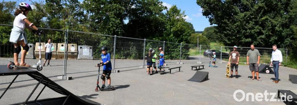 Wo früher die Gäste des Gasthauses Bienenhof in Aschach ihre Autos abstellten, können sich derzeit Kinder und Jugendliche auf einer mobilen Skateranlage vergnügen. Möglich macht dies eine Freizeitanlage der Kommunalen Jugendarbeit Amberg-Sulzbach (KOJA), die in den letzten Ferienwochen dieses Jahres in der Gemeinde Freudenberg aufgestellt ist. Nach einer Woche in Paulsdorf erfolgte der Umzug nach Aschach, wo nun Bürgermeister Alwin Märkl und der Jugendbeauftragte Christian Drexler den Startschuss gaben. Die Anlage kann bis Sonntag, 19. September, an allen Tagen der Woche genutzt werden. An den kommenden Samstagen findet jeweils von 14 bis 17 Uhr ein Skate-Workshop unter fachlicher Leitung eines KOJA-Teams statt. Dabei wird gezeigt, wie man am besten fährt und worauf man achten muss. Das Skate-Training ist kostenlos. Scooter und Skateboards sowie die Schutzausrüstung können vor Ort kostenfrei ausgeliehen werden. Eine Anmeldung ist nicht erforderlich.