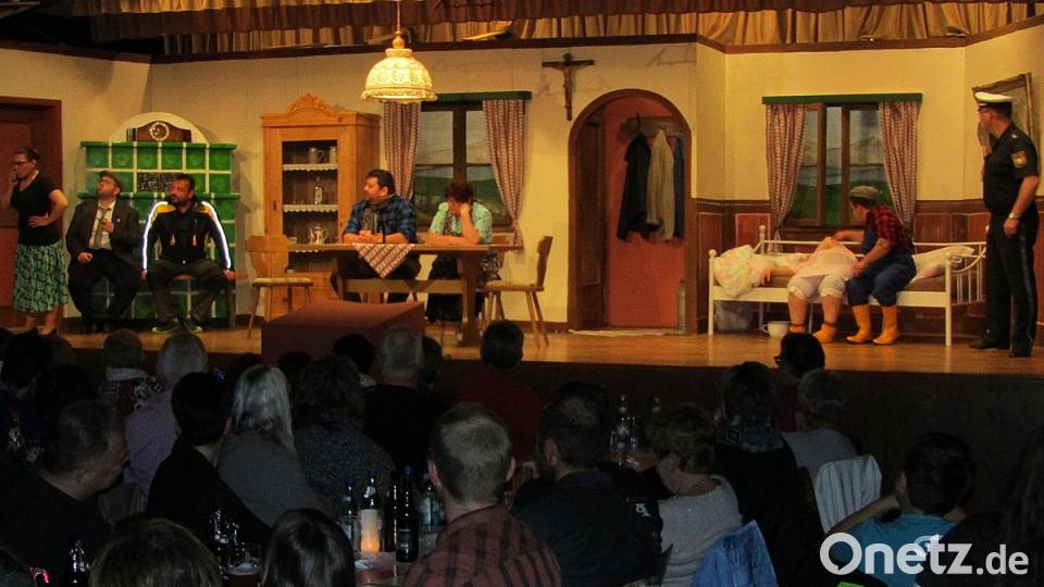 Rechts auf der Bühne stand ein Bett, denn Bauer Jakob Damler (Markus Baumgärtel) war gerade von Bäuerin Loni Damler (Katrin Himmelhuber) aus dem Schlafzimmer ausquartiert worden. Das Theaterstück, das Kerstin Meisel und Sonja Sertl ausgewählt hatten, brachte die Geschichte vom Bürgermeister einer Gemeinde, der das Rauchen aufgegeben hat.