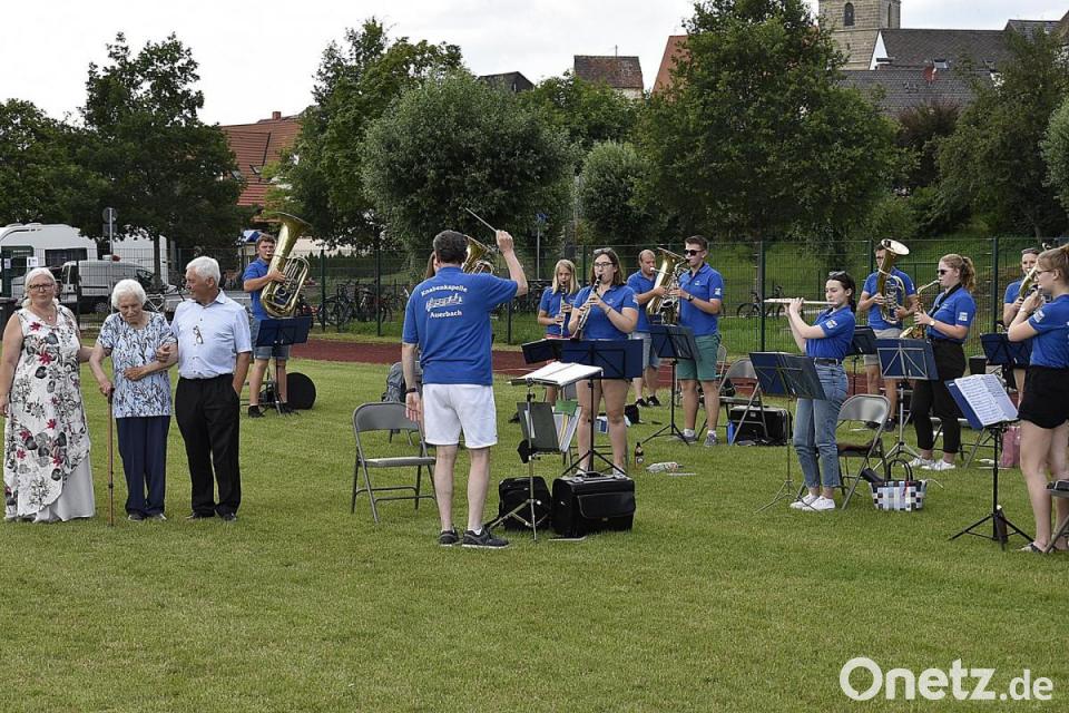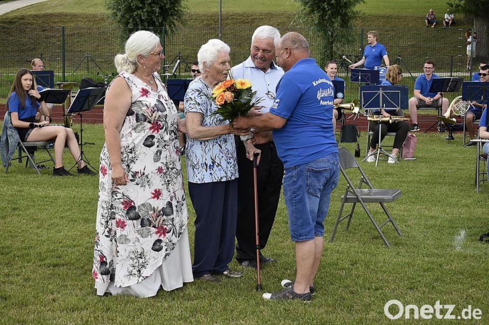 Ihren 90. Geburtstag feierte Babette Bernt am Sonntag im engsten Familienkreis. Tochter Edeltraud und Sohn Franz bereiteten ihrer Mutter jedoch eine besondere Überraschung und brachten sie zwischendurch mit dem Kleinbus zum Blasmusik-Picknick der Knabenkapelle Auerbach auf dem Schulsportplatz. Hier zeigte sich die Jubilarin wetterfest und genoss die musikalischen Darbietungen. Dirigent Ludwig Riedhammer gratulierte und ließ seine Musiker ein Geburtstagsständchen darbringen. Gemeinsam sangen die Picknick-Gäste das Geburtstagslied für die Jubilarin, eine geborene Ölmann aus Königstein, die mittlerweile in Auerbach bei ihrer Tochter Edeltraud lebt. Elmar Hamerla, der Vorsitzende der Knabenkapelle, ließ erst den Gesang und die Musik verklingen, bevor dann auch er unter dem begeisterten Beifall der Konzertgäste die zweifache Mutter, Oma von sechs Enkeln und Uroma von vier Urenkeln mit einem Blumenstrauß zum 90. Geburtstag beglückwünschte.