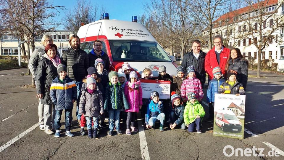 Kranken Menschen einen Traum zu erfüllen, kann einiges Geld kosten. Dabei hilft ein Scheck über 750 Euro aus der Städtischen Kindertagesstätte "Pfiffikus" für das Herzenswunsch-Hospizmobil.