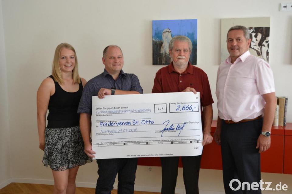 Nach der Entscheidung des Arbeitskreises 900 Jahre Kloster Michelfeld, abgesprochen mit dem Theaterverein D' Veldensteiner, geht der Überschuss als Spende an den Förderverein St. Otto Michelfeld - zur Sanierung des Pfarrheims. Theatervereinsvorsitzender Joachim Kroher überreichte im Beisein von Bürgermeister Joachim Neuß den symbolischen Scheck an Johannes Lindner, Vorsitzender des Fördervereins St. Otto. Bürgermeister Neuß würdigte in diesem Kreis den Einsatz aller beteiligten Vereine und ehrenamtlichen Helfer. Bislang flossen aus den Erlösen der Jubiläumsveranstaltungen insgesamt rund 6800 Euro an Spenden an den Förderverein St. Otto.