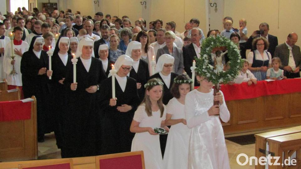Der Gottesdienst begann mit einem feierlichen Einzug des liturgischen Dienstes, voran drei weiß gekleideten Mädchen und die Professinnen. Die musikalische Gestaltung der Liturgie übernahmen Georg Schäffner an der Orgel, der Schwesternchor unter Leitung von M. Theresia Hauthaler und die Instrumentalgruppe der Ordensschwestern. Mehr als 20 Priester folgten mit Erzbischof Schick.
