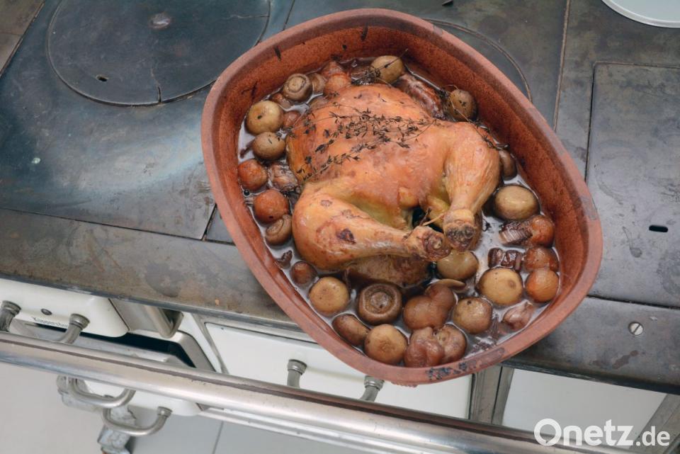 Das Huhn waschen und abtupfen, auf beiden Seiten scharf anbraten – jeweils nur einige Minuten. Herausnehmen und mit Rosmarin-, Thymianzweigen, zwei zerdrückten Knoblauchzehen sowie zwei Schalotten füllen. Innen mit Salz und Pfeffer würzen. Das Huhn in eine feuerfeste Form legen.