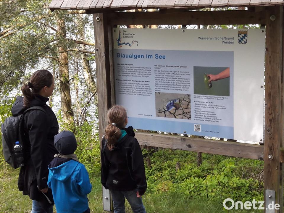 Wir – zwei Erwachsene, zwei Kinder (acht und fünf Jahre) – machen uns von Gütenland (Stadt Neunburg) aus auf die kürzere, die rund zwölf Kilometer lange Strecke. Am Campingplatz „Haus Seeblick“ vorbei stoßen wir direkt auf den Hauptdarsteller des Tages – den beeindruckenden wie attraktiven Eixendorfer See, den wir fast nie aus den Augen verlieren und der aus allen Richtungen stets ein lohnenswerter Blickfang ist. Der befestigte Weg ist mit bequemen Schuhen zu bewältigen, für Kinderwägen ist die Strecke an einigen Punkten eher ungeeignet.