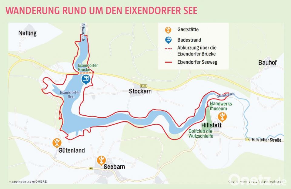 Beim Seeweg kann der Wanderer die knapp 15 Kilometer lange Route wählen, oder via Eixendorfer Brücke auf rund 12 Kilometer abkürzen. Der Startpunkt kann individuell gewählt werden, entweder in den Ortschaften Gütenland, Seebarn, Hilstett oder an verschiedenen Parkplätzen, die sich rund um den circa 110 Hektar großen See direkt am Ufer befinden.