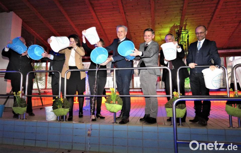 Künstlerin Susanne Neumann hielt sich bei der Vorstellung des Projekts von künstlerischer Seite kurz. Statt eines "Spatenstiches" hatte sie sich etwas anderes einfallen lassen. Die Ehrengäste schütteten Wasser aus dem nahen Muglbach, mit Rosen veredelt, ins leere Badehausbecken. Musikalisch wurde der Festakt von Johannes Burger, Resi Braun und Fritz Söllner gestaltet.