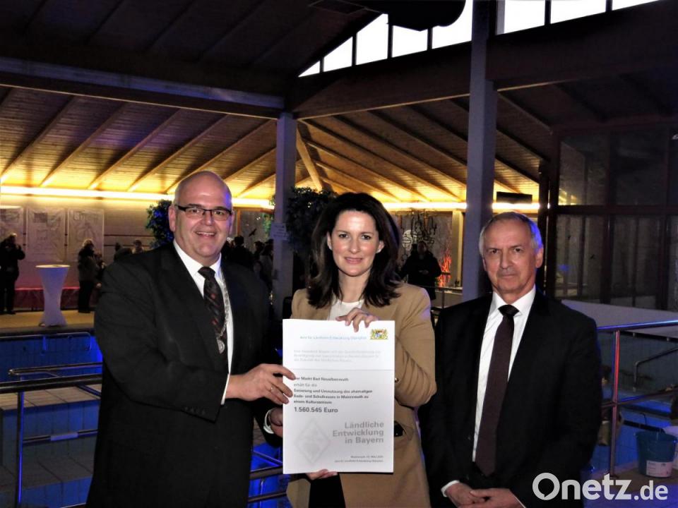 Staatsministerin Michaela Kaniber vom Ministerium für Ernährung, Landwirtschaft und Forsten brachte den Förderbescheid in Höhe von sage und schreibe 1,6 Millionen Euro vorbei. Bürgermeister Klaus Meyer und Künstlerin Susanne Neumann, die das Badehaus in Zukunft als Kunst- und Kulturstätte leiten wird, strahlten über das ganze Gesicht vor Freude. Unter den Gästen befand sich auch MdL Tobias Reiß und Künstler Jeff Beer, der für das Fest eine Lichterinstallation im Badehaus gemacht hatte. Bürgermeister Klaus Meyer bezeichnete den Festakt als Meilenstein in der Geschichte von Bad Neualbenreuth. Vor über 30 Jahren sei hier der Spatenstich für den Grundstein des jetzigen Sibyllenbades gelegt worden. "Damals wie heute waren Künstler vor Ort," erinnerte sich Meyer.