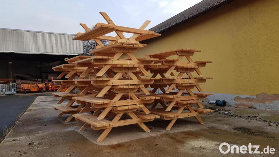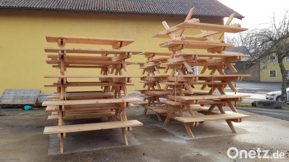 Bis die Sitzmöbel an den jeweiligen Plätzen in freier Natur gebracht sind, lagern sie erst einmal in der Ortsmitte von Bad Neualbenreuth. Auf dem ehemaligen Raiffeisen-Areal sind die Picknickbänke gestapelt – auf dem Platz, wo früher die großen Silos standen.