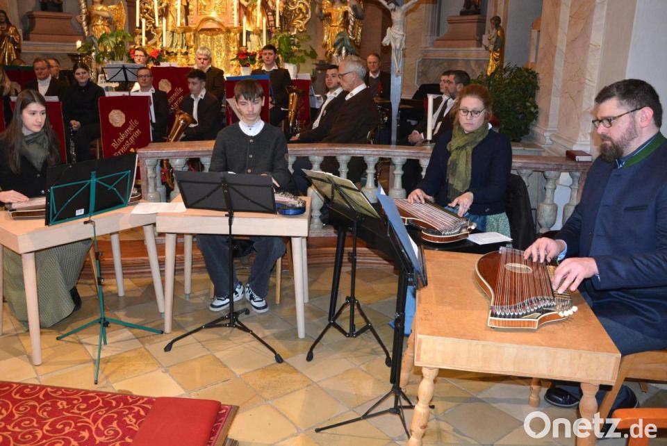 Mit dabei war auch das Neualbenreuther Zwio mit Monika Kunz und Franz Danhauser sowie „D’Engl“ mit ihren bekannten Stimmen. Das vierköpfige Zitherquartett unter der Leitung von Regina Frank, bestehend aus den Musikern Lena Bäuml, Paul Gleißner und Christof Frank, spielte ein Menuett. Mit „Ei Manna, schaut’s affe“ erinnerte das Neualbenreuther Zwio an ein Egerländer Weihnachtslied.