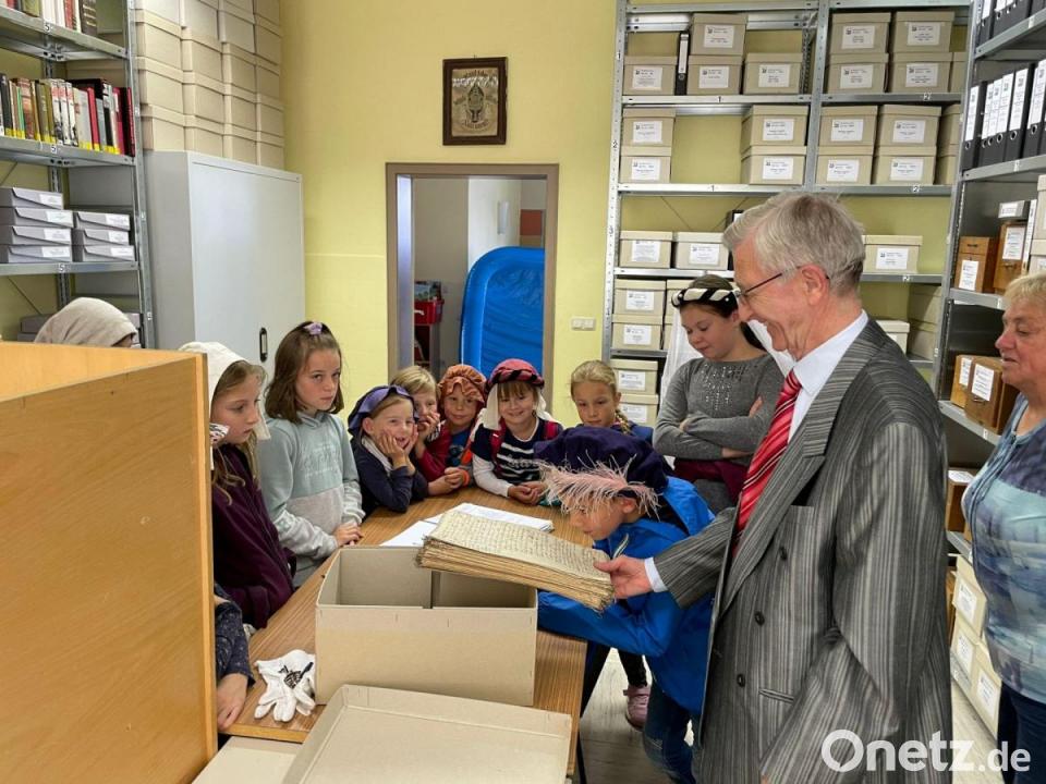 Um das Thema "Altes Bärnau" zu betonen, hatte Ingrid Leser noch einige historische Gewänder mitgebracht. Mit altertümlichen Kopfbedeckungen stieg die Gruppe in die Führung ein. Ein Mädchen durfte eine der nummerierten und mit Jahreszahlen versehenen Schachteln aussuchen. Diese entpuppte sich als Heiratsurkunde um 1904, in einer eigenartigen Schrift, die die Kinder nicht lesen konnten. Rösch klärte sie weiter auf: Wer in einem Stadtarchiv arbeitet, sollte die Deutsche Schrift kennen, um Urkunden und Berichte von früher lesen zu können. Die Kinder stellten fest, dass so manches alte Schriftstück eigenartig roch. Höchst interessant waren die alten Wachssiegel mit unterschiedlichsten Motiven - besonders das große Siegel Kaiser Karl IV. beeindruckte die Mädchen und Jungen. Die Kinder durften wertvolle Urkunden aus dem 14. Jahrhundert besichtigen, die nicht mit bloßen Händen berührt werden dürfen. Dazu trug Rösch feine Handschuhe. Im Anschluss durften die Teilnehmer ein Bild für ein Wappen oder eine Urkunde entwerfen und malen. Als Erinnerung erhielten die Kinder Urkunden für ihren Besuch im Archiv.