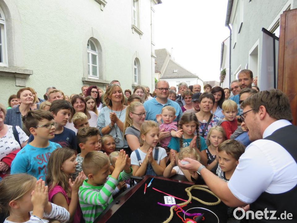 Jetzt wollten die Kinder mitmachen. Knott ließ die Buben und Mädchen einen in sich geschlossenen Strick halten, aus dem er einen Reifen holte, ohne das Seil zu zerschneiden. Groß war die Begeisterung, als er seinen Spielkarten-Trick preisgab. Nach einer kurzen Pause ging's gleich weiter mit der Zauberei, denn schon wollten die nächsten Kinder und Erwachsenen die zweite Aufführung des "Jubiläumszaubers" erleben und sehen welche coolen Tricks der neue "Harry Potter" der Knopfstadt Bärnau drauf hat.