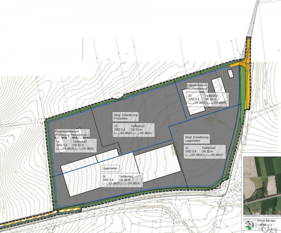 In dem Entwurf des Planungsbüros TB Markert finden sich auch Angaben zur Lage der Gebäude sowie deren Beschaffenheit. So sollten nach Süden zur Umgehung hin Bauhöhen bis 30 Meter vorgeschrieben werden, nach Nordenwesten hin könnten sich Bereiche mit Höhen bis zu 50 Meter finden. Dort wäre dann auch das Heizwerk oder die Trocknungsanlage vorgesehen. Konkrete Emissionsbegrenzungen würden sich erst im Laufe des Verfahrens ergeben.