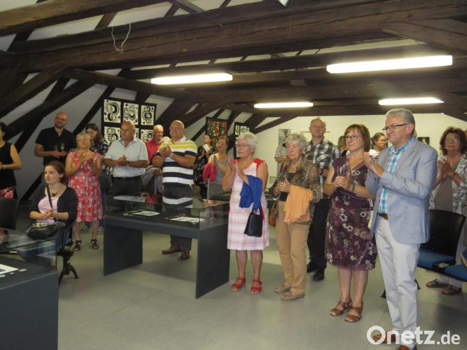 Museumsleiterin Andrea Bäuml schwärmte von den wunderbaren Unikaten, die Jutta Kohlbeck im Ausstellungsraum hervorragend platziert habe: "Kein Kopf gleicht dem anderen." Einzigartig nannte Bäuml auch die musikalische Begleitung der Vernissage. "Alles haben wir schon gehabt, von Flöte über Harfe bis hin zur Blasmusik!" Jutta Kohlbeck demonstrierte an einer überdimensionalen Holzscheibe die hohe Kunst, der Posamentenknopf-Wickelung. Die filigranen Ergebnisse seien keine Zauberei, sagte sie. Vielmehr handele es ich um ein uraltes, überliefertes Kunsthandwerk aus dem 16. und 17. Jahrhundert, dessen Blütezeit im 18. Jahrhundert gewesen sei. Sie verwies auf die 99 Trachtenknöpfe in den Vitrinen, die sie geschaffen habe. Diese seien notwendig gewesen, um die Prüfung zur Knopfmacherin zu bestehen. Im Grunde erinnere die Technik an Weben, wobei auch die speziell gewünschte Farbgebung gestaltet werden könne. Mit entsprechender Übung könne man schöne Ergebnisse erzielen. "Ich freue mich, wenn Sie sich über die Ausstellungsstücke freuen", schloss die unkomplizierte und offenherzige Regensburgerin ihre Ausführungen über die Entstehung eines Teils ihrer Werke.