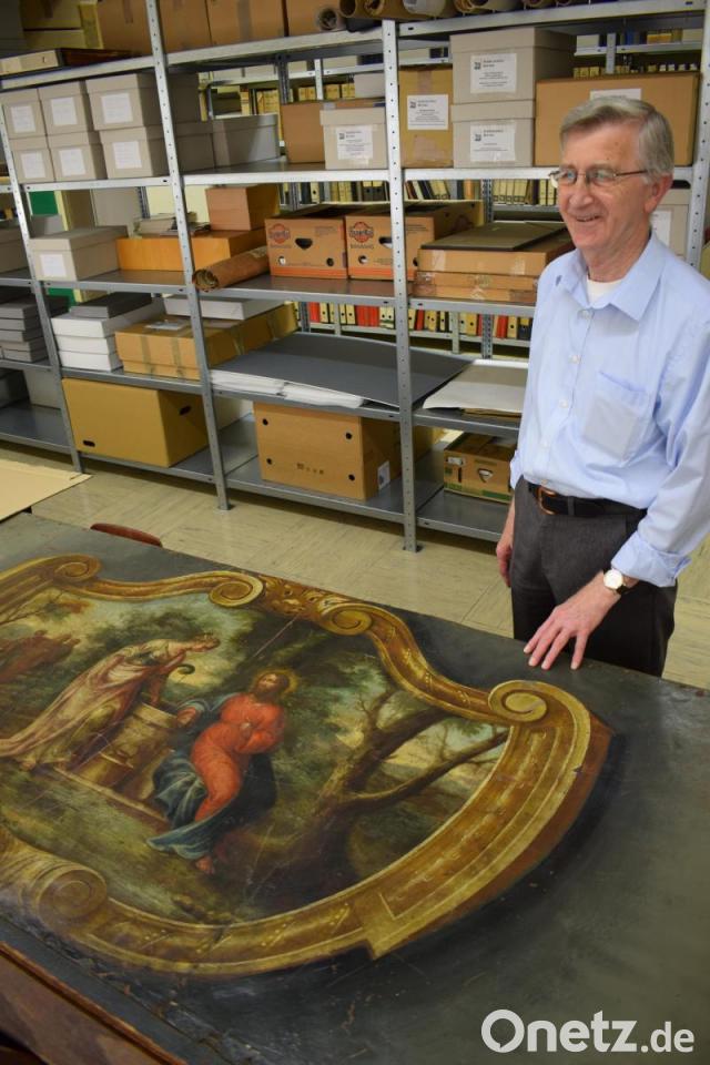 "Das muss man sofort sichern, es gibt kaum noch so ein Original", sagt Leser. Seit gut zwei Jahren bewahrt Josef Rösch das Stück nun im Stadtarchiv auf. "Ich hab es zu mir geholt." Die Lagerung für so ein historisch wertvolles Bild war ihm im Bauhof zu unsicher. "Die Mitarbeiter haben sich alle nichts dabei gedacht, wie wir alle." 2018 wurde das Bild noch einmal für die Fronleichnamsfeier benutzt, obwohl es schon im Archiv eingelagert war. "Sepp, das darfst du nicht mehr rausrücken", sagt Ingrid Leser zum Stadtarchivar. Sie vermutet, dass das Bärnauer Antependium, vermutlich ein Stück des Seitenaltars, um 1800 entstanden ist, ganz sicher noch vor der Säkularisation 1804. "Die Samariterin am Jakobsbrunnen" ist auf Blech gemalt, welches wiederum an einem etwa ein mal zwei Meter großen Holzrahmen befestigt ist - ebenfalls typisch für Maurus Fuchs. Wie auch Gegenstände im Vordergrund der Malerei, etwa Gefäße, Stäbe oder Hüte, weiß Leser. Durch die drei verwaschenen Menschen im Hintergrund entstehe die Tiefenwirkung, analysiert die Kreisheimatpflegerin.