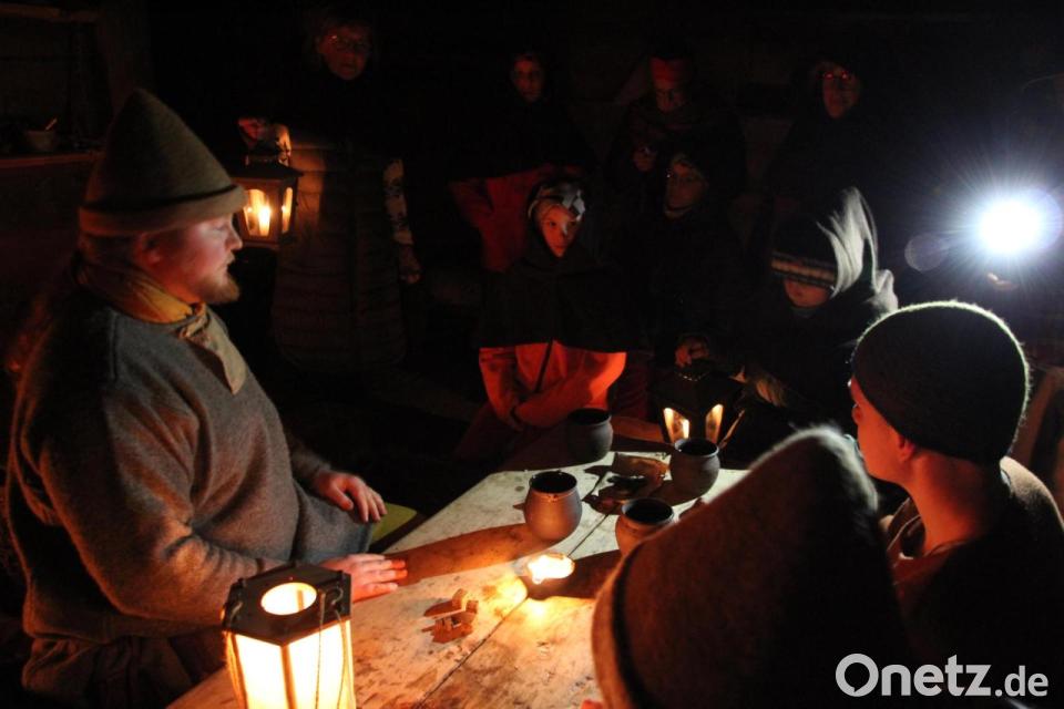 Nur ein paar hundert Meter weiter hatte das archäologische Freiluftmuseum, der Geschichtspark Bärnau-Tachov, zur Langen Museumsnacht eingeladen, die es in sich hatte: Denn im Blickpunkt dieses Abends und der folgenden Nacht standen Führungen durch den finsteren Geschichtspark, der nur mit einigen Orientierungslampen geringfügig erhellt war. An der ersten Führung, die Friederike Schwägerl leitete, beteiligten sich vor allem viele Kinder und Jugendliche, die teilweise ausgestattet mit Laternen einen Blick in die verschiedenen Häuser werfen durften. Vor allem für die Kinder war dies sicherlich sehr erlebnisreich und teils sogar mystisch, zumal der raue „Böhmische“ nicht gerade für wärmende Temperaturen sorgte. Sagenumwoben dann die einzelnen Häuser, in denen nur ein Holzfeuer brannte, das zur Wärme, aber auch zum Erhellen im Häuschen diente. Obwohl es draußen sehr kalt war, war dies im Inneren der Häuser gar nicht der Fall. Eindrucksvoll war auch, wie einer der Bewohner den Besuchern das Anmachen und Entfachen eines Feuers mit einem Feuerstein demonstrierte, so wie das eben im Mittelalter gemacht wurde.