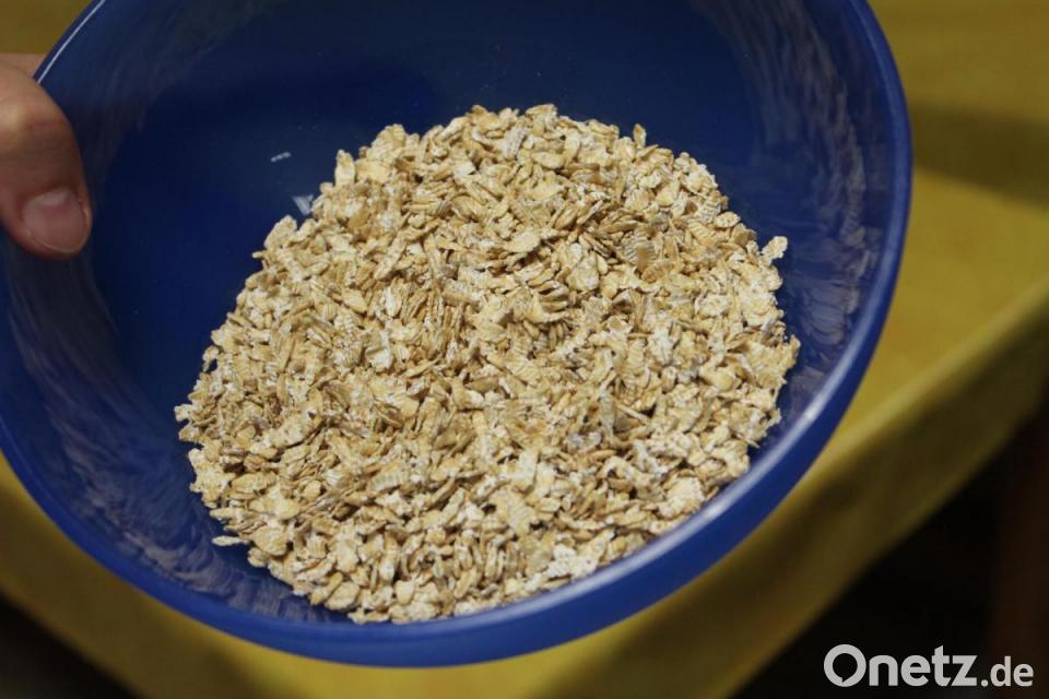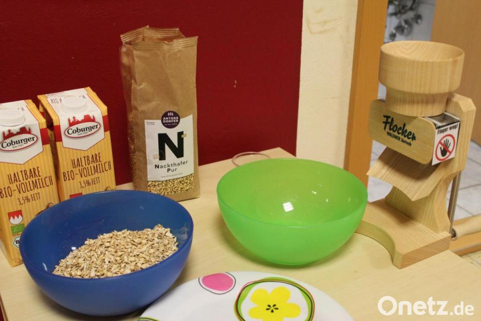 "Fest drücken", ermutigte Erzieherin Saskia Weigl die Kinder. "Geht es schwer?", fragte sie einen kleinen Jungen. Er drehte kräftig am kleinen Hebel der Haferpresse. "Nein, geht nicht schwer", antwortete er souverän. Die Haferflocken rieselten in eine blaue Schüssel. "Die können die Kinder in der Pause als Müsli mit ein bisschen Obst und Milch essen", erklärte Petra Prölß. Bei den Fühstückswochen gab es Brotspieße, die als "Piratenspieße" getarnt waren, Gemüsesticks mit Quark-Dip, Leberwurst-Schnitten und frisches Obst. Aus diesen Pausen-Leckereien konnten die Kinder während der "Frühstückswoche" auswählen, um ihre Brotzeitdosen gemeinsam mit ihren Eltern bei der morgendlichen Ankunft im Kindergarten zu befüllen. "Viele waren erstaunt über die Vielfalt des Frühstücksbuffets", fasste die Gesundheitsexpertin die Reaktionen der Eltern zusammen.