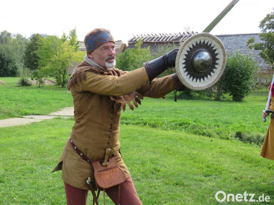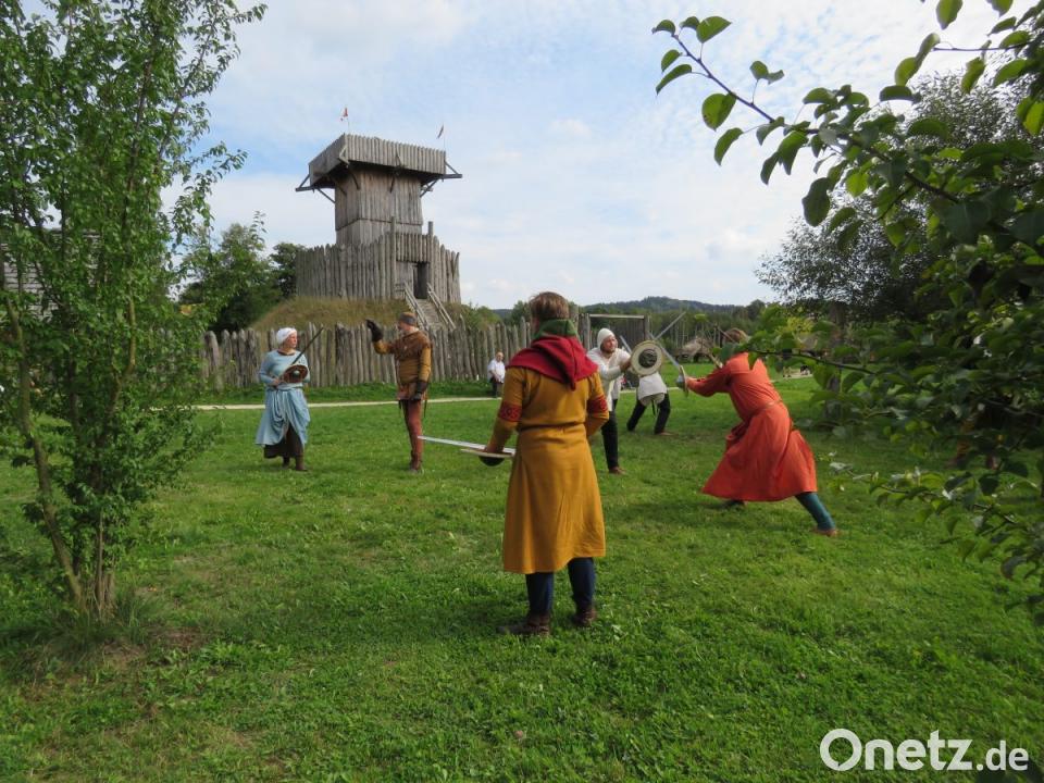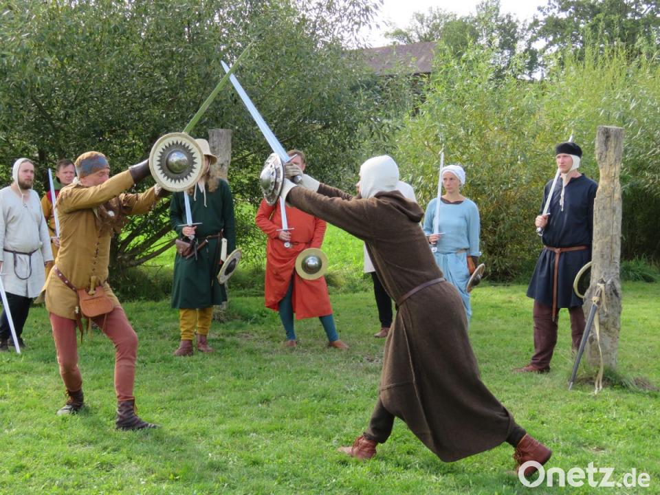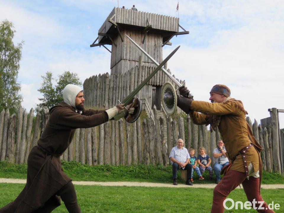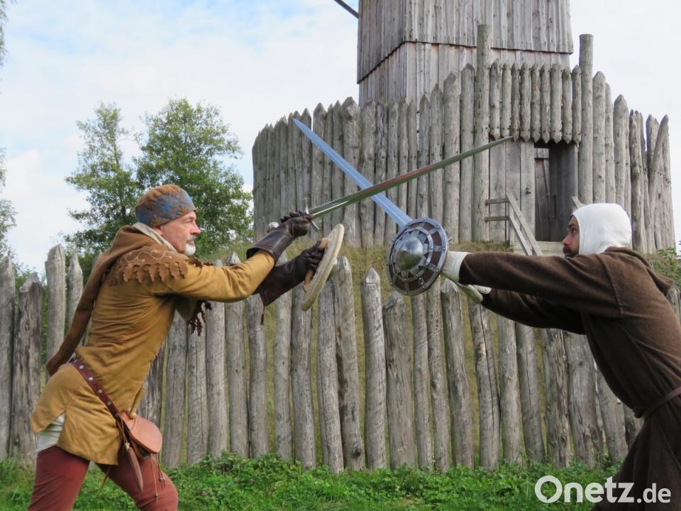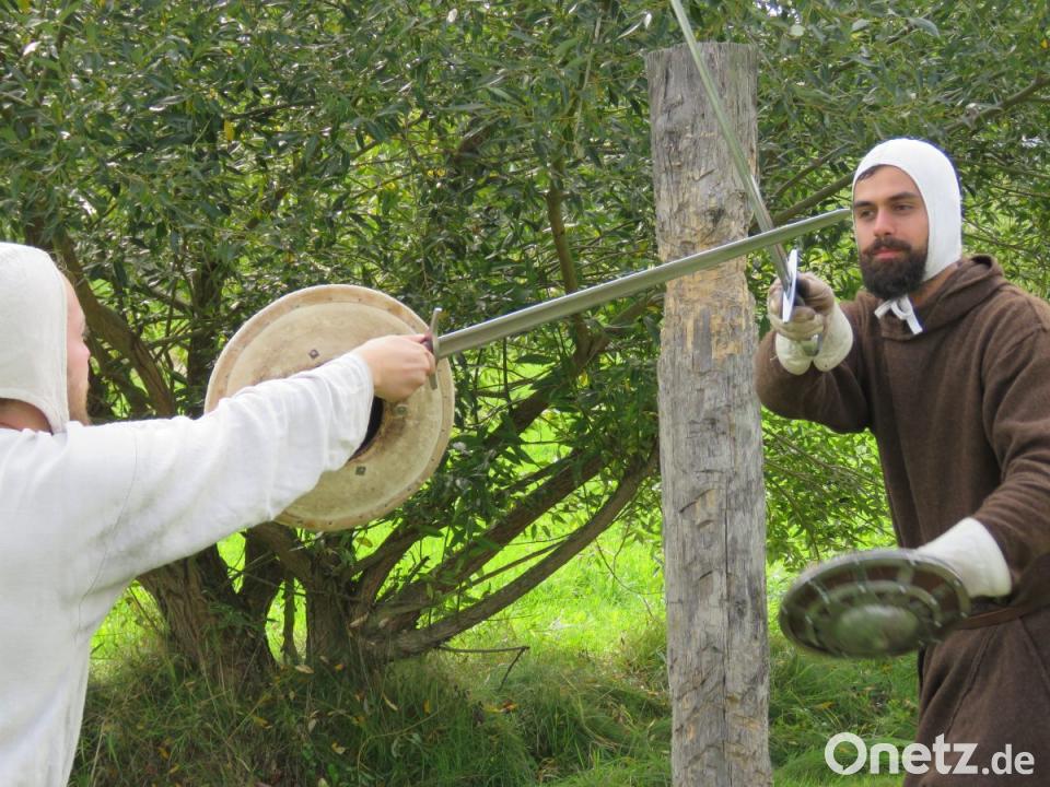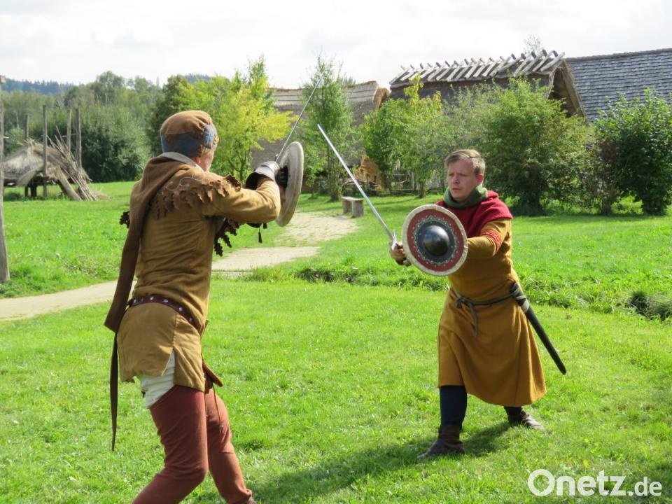 Die beiden Akteure mit den Schwertern scheinen fast zu schweben. Sie tänzeln. Was Warzecha und Berthold hier zeigen, ist die hohe Kampfkunst, wie sie schon vor über 1000 Jahren praktiziert wurde. Die zwei Männer leiten an diesem Tag ein Schwertkampf-Seminar im Geschichtspark.