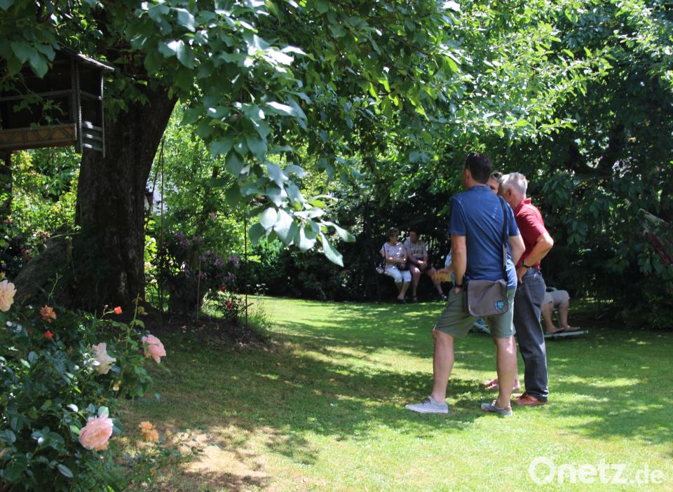 Kletterrosen, die meterhoch in die Kronen der Obstbäume wachsen, schickten den Gästen wahre Blütenregen entgegen. Duftrosen begrüßten die Besucher schon beim Eingang und versetzten sie buchstäblich in eine andere Welt. Alleine der beeindruckende Anblick, den der interessierte Besucher bekommt, wenn er durch den Wintergarten am Garteneingang geht. Denn an dessen Decke ranken sich die mit Trauben bewachsenen Reben eines großen Weinstocks entlang. Von den Gästen waren beim Rundgang sämtliche Superlative zu hören, denn die Familie Standfest hat ihren Garten über die Jahre sehr wohlüberlegt, mit Geschmack, Können und Liebe zur Natur gestaltet. Inmitten der vielen Rosen, Blumen- und Pflanzenarten fanden dabei auch kleine eigene Wohlfühlorte ihren Platz. Vom Gartenteich mit blühenden rosafarbenen Seerosen bis zum schattigen Plätzchen unter den riesigen alten Obstbäumen mit Hängematte, Schaukelstuhl und Sitzgarnitur. Überall gibt es farbenprächtige Rosen, manchmal gemischt mit anderen Pflanzenarten, immer aber als wahre Farbexplosion. Rote Rosen ranken sich am Haus empor fast bis unters Dach, weiße Rosen blühen vor einem Obstbaum und mischen sich mit gleichfarbigen Clematis. Und unter den Obstbäumen lädt der Springbrunnen mit dem kleinen steinernen Leser zum Verweilen ein. Dazu wunderschöne Pfingstrosen mit ihrem üppigen Blütenreichtum. Und immer wieder dürfen Besucher durch prächtig blühende Rosenbögen gehen und sich dabei wie in einem Schlossgarten fühlen.