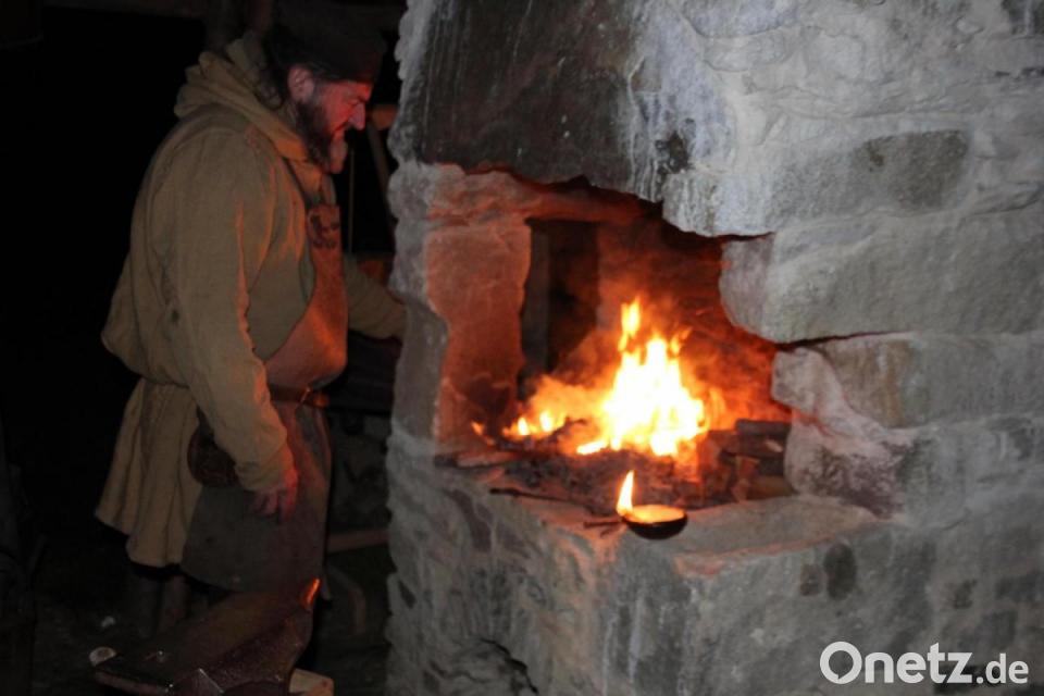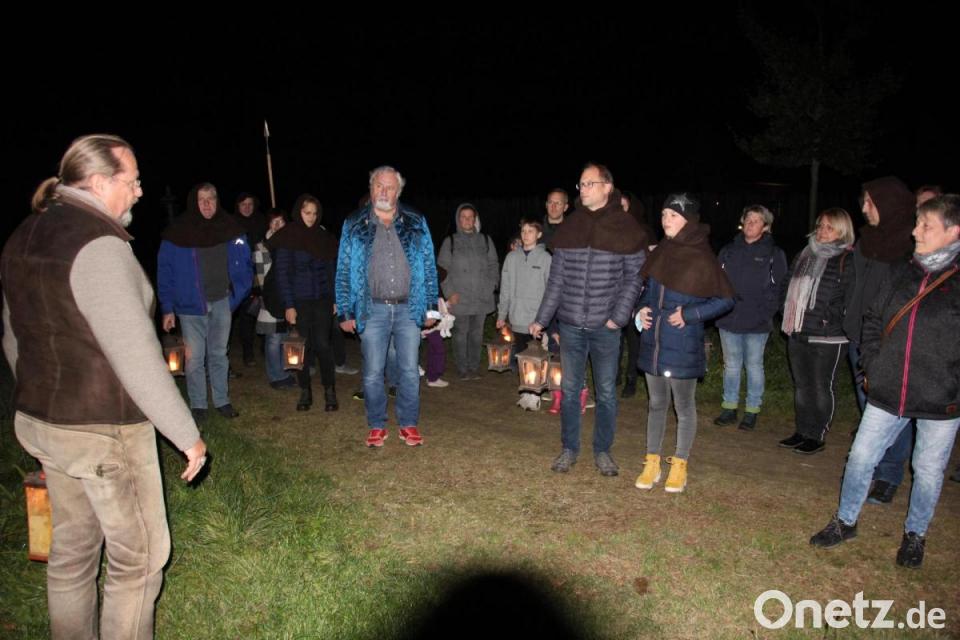 Die Gäste wurden vom Geschichtspark-Team mit Gugeln ausgestattet. Die mittelalterlichen kapuzen-ähnlichen Kleidungsstücke sollten die Gäste vor der Kälte schützen. Dazu gab es Laternen, die in der Finsternis ein bisschen Licht spendeten. Wolters verwies darauf, dass diese Wanderung ein ganz besonderes Naturerlebnis sei, eben so, wie es wohl im auch Mittelalter war: Die Dunkelheit war den Menschen unheimlich, denn sie konnten ja nichts sehen. Die anderen Sinne wurden deshalb geschärft. "Kurzum, nachts ging man einfach nicht hinaus", sagte Wolters. Mit einigen lockeren Sprüchen erheiterte er die Besuchergruppe. Auf dem Weg kamen die Teilnehmer auch an einem Schmied vorbei, der in der Dunkelheit sein Eisen schmiedete. Gerade in der Finsternis könne er anhand der Farbe der Glut sehr schön die Temperatur des erhitzten Eisen erkennen, erklärte der wissenschaftliche Leiter.