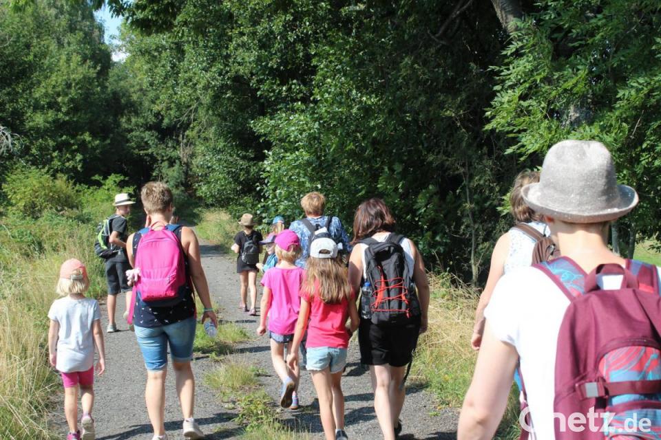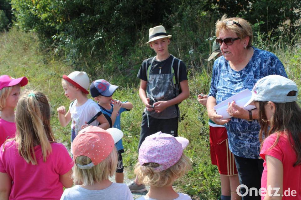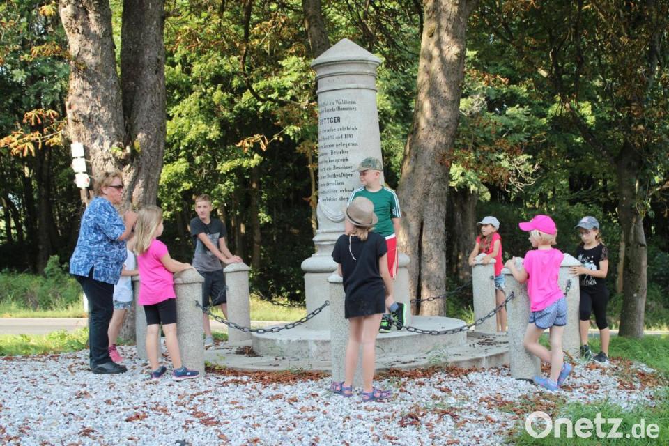 Die Gruppe, der sich auch Eltern angeschlossen hatten, um sich mit ihren Sprösslingen auf eine Zeitreise zu begehen, machte sich auf ihren Weg Richtung Böttgersäule, die im ehemaligen Vorder-Paulusbrunn steht. Ingrid Leser hatte viel zu berichten von der damaligen Zeit. Während der Wanderung nutzte sie die Trinkpausen, um den Kindern die Heilkräuter, die am Wegesrand standen, zu erklären. Auch geschnuppert werden durfte an den natürlichen Heilmitteln, denn die Tour stand unter dem Motto "Sehen, hören und riechen". Die Route führte vorbei am "Biber-Areal", wo die kleinen Nager schon ganze Arbeit geleistet hatten, denn viele Bäume waren mit "Knabber-Spuren" gekennzeichnet oder umgeknickt. "Hört ihr das Rauschen", fragte die Natur-Expertin die Kinder. "Das sind die Zitterpappeln, die klingen besonders schön, wenn der Wind durch ihre Blätter fährt", erklärte sie.