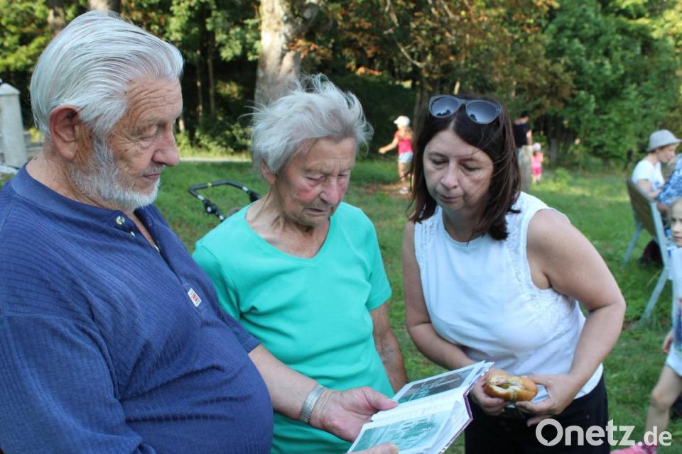 Nach der Pause konnte frisch gestärkt zur letzten Station aufgebrochen werden, dem alten Friedhof von Paulusbrunn. Beeindruckt von der Atmosphäre studierten die Kinder die Namen auf den Grabsteinen. Wieder zurück an der Böttgersäule hatten die kleinen Teilnehmer noch viel Freude beim gemeinsamen Herumtollen. Zeitzeuge Ferdinand Zwerenz schwelgte derweil mit der "Oma vom Schmuckerhof" in Erinnerungen, während sie ein Fotoalbum durchblätterten.