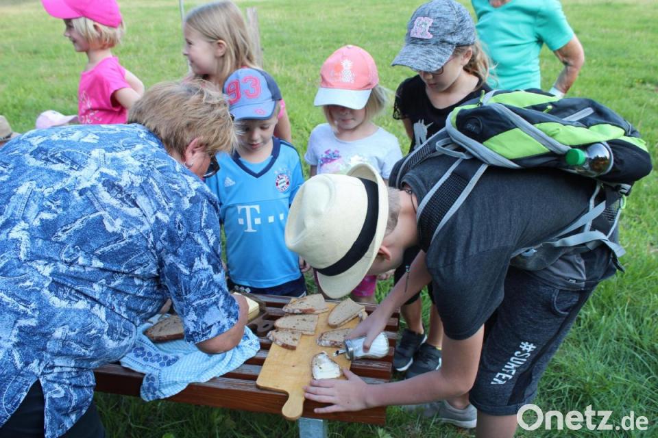 Als sich Zeitzeuge Ferdinand Zwerenz der Gruppe anschloss, hatte er einiges zu berichten. Der Bärnauer, der in Paulusbrunn geboren wurde und dort seine Kindheit verbrachte, erlebte hautnah mit, wie er mit seiner Familie und die anderen Dorfbewohner ausgesiedelt wurde. Er erklärte der Gruppe, wo ehemals das Schulhaus stand und wusste, dass heute nur noch Baumgruppen an die Standorte der damaligen Anwesen und Siedlungen erinnern. Als nach gut zwei Stunden Fußmarsch die Böttgersäule erreicht wurde, hatte Ingrid Leser noch eine besondere Überraschung in petto. Um den Kindern auch die kulinarische Seite des früheren Dorfleben zu demonstrieren, hatte sie eine typische Brotzeit von damals dabei. Es gab Butterbrote mit Zucker bestreut. Die Freude war groß, als die Organisatorin den Kindern das Fangspiel "Bäumchen wechsle dich" erklärte. Kurzerhand wurde die Böttgersäule zum Spielfeld erklärt.
