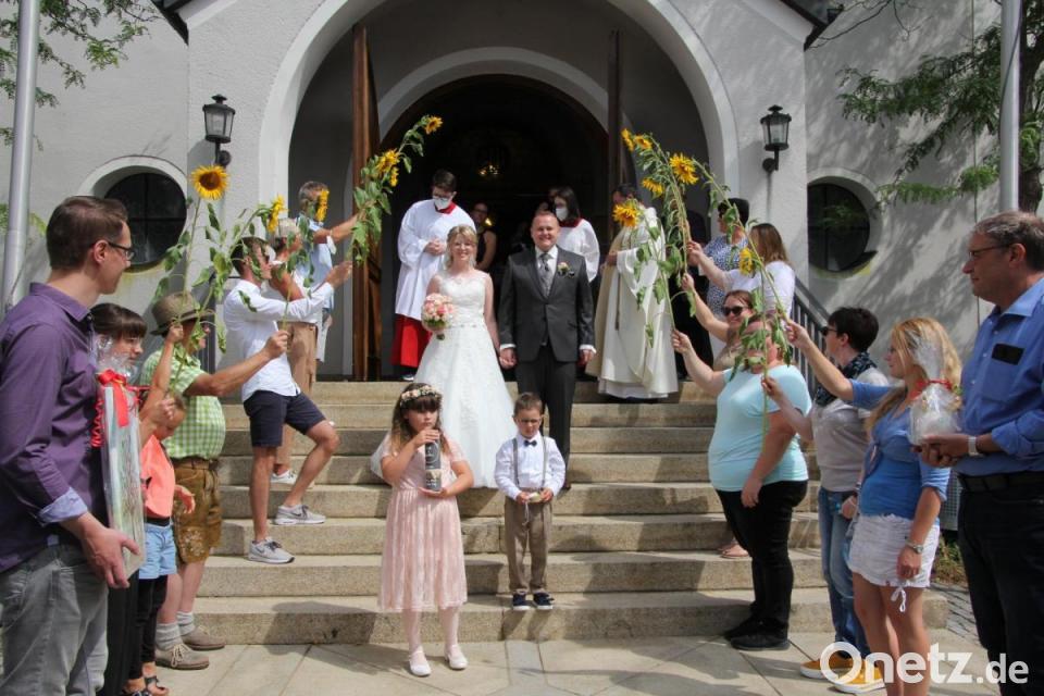 Die Trauung nahm Pfarrer Konrad Amschl vor, gesanglich wurde der Trauungsgottesdienst vom Bärnauer Chor "Klangfarben" umrahmt. Nach der Trauung wurde das frisch vermählte Paar von den Arbeitskollegen des Jobcenters, alle mit Sonnenblumen ausgestattet, und den Fußballern der SG Großkonreuth im Ehrenspalier erwartet. Eine starke Formation der "Grenzlandbuam" Bärnau unter der Leitung von Günther Freundl spielte sogleich dem Paar ein längeres Ständchen, unter anderem den "Böhmischen Traum" und "Wir Musikanten". Die Braut spielt in der Kapelle die Klarinette und ist zudem als Zweite Schriftführerin in der Vorstandschaft.