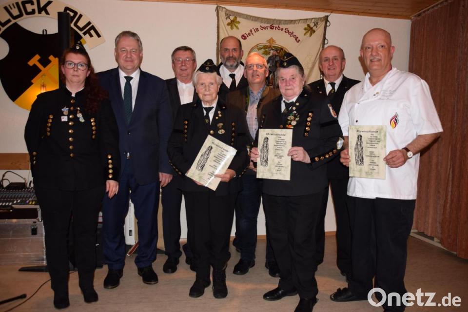 Für 25-jährige Mitgliedschaft ehrten die Bergknappen ihren Vereinswirt Peter Pesold-Geisler mit der Nadel in Silber. Auf 40 Jahre blicken Babette Bernt aus Auerbach und Anna-Maria Specht vom Breitenstein zurück. Sie erhielten die Vereinsnadel in Gold. Margarete Strobel wäre ebenfalls für 40 jährige Mitgliedschaft geehrt worden, ließ sich aber aus gesundheitlichen Gründen entschuldigen.