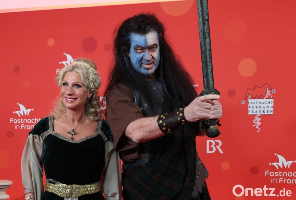 Markus Söder (l, CSU), Ministerpräsident von Bayern, nimmt als "Braveheart" an der BR-Livesendung "Fastnacht in Franken" in den Mainfrankensälen teil.