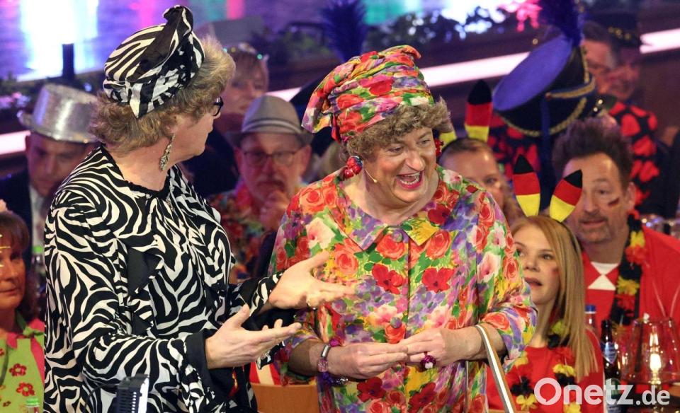 Waltraud (l) und Mariechen treten während der BR-Livesendung "Fastnacht in Franken" in den Mainfrankensälen auf. Bei der Prunksitzung des Fastnachtverbandes Franken müssen traditionell Politiker Spott und Narretei ertragen.