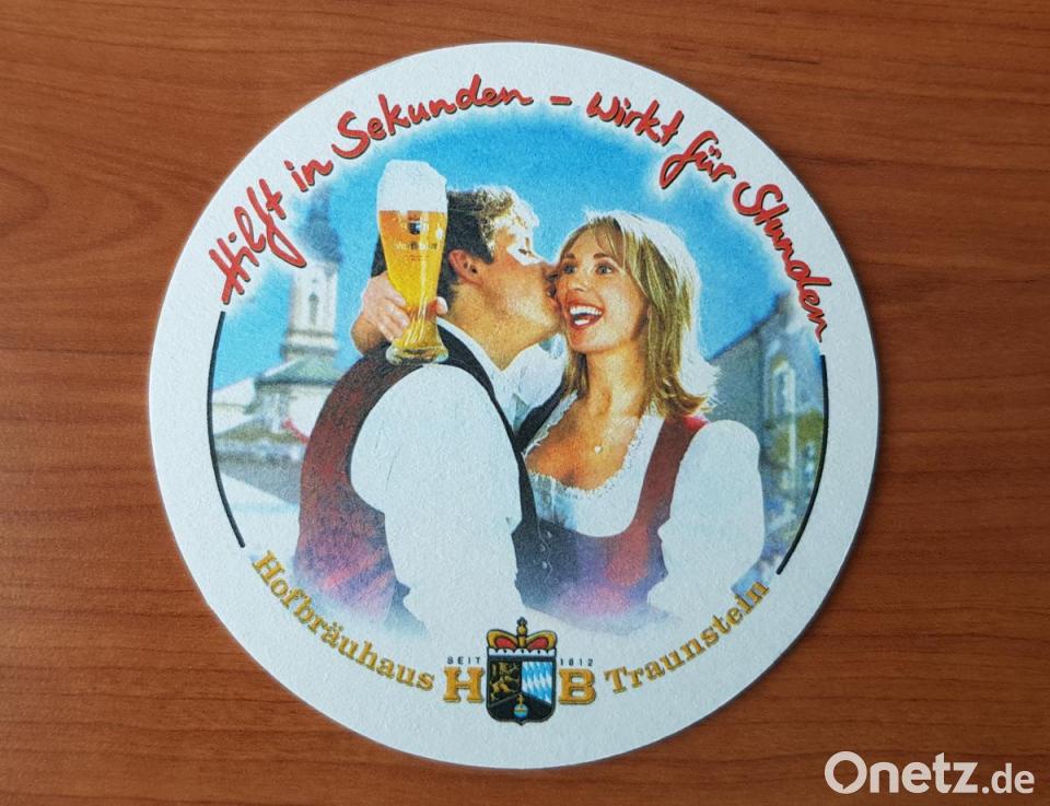 Traunstein. Das Bild auf dem Bierdeckel vom Hofbräuhaus Traunstein zeigt Brauereichef Maximilian Sailer, der seiner Frau Brigitte ein inniges Bussi gibt - während sie ein volles Weißbierglas anhimmelt. „Hilft in Sekunden - wirkt für Stunden“, ist dazu zu lesen. Der Bierdeckel werde seit 2005 in Millionenauflage an Kunden verteilt, sagte Geschäftsführer Josef Schumacher. „Selbstverständlich bleiben wir dabei. Da wird nichts geändert. Da sind wir wie die kleinen Gallier gegen die fernen Römer.“