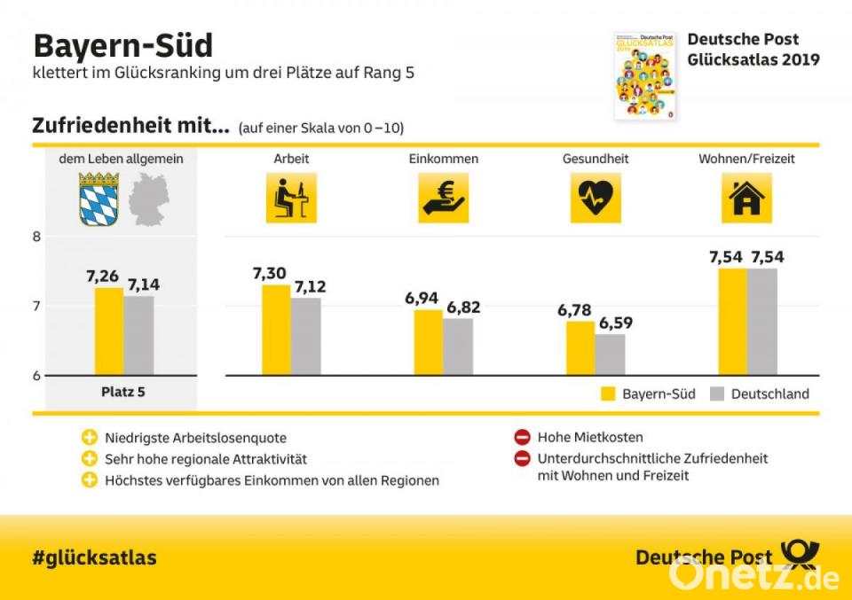 Die Gesamt-Entwicklung sei etwa der niedrigen Arbeitslosenrate, guten Lohnabschlüssen und der soliden Gesundheit der Bevölkerung geschuldet, hieß es. Im Vergleich der deutschen Regionen sind Tabellenführer und -schlusslicht gegenüber 2018 unverändert: Die zufriedensten Menschen sieht der Glücksatlas in Schleswig-Holstein (7,44 Punkte), die unglücklichsten in Brandenburg (6,76).