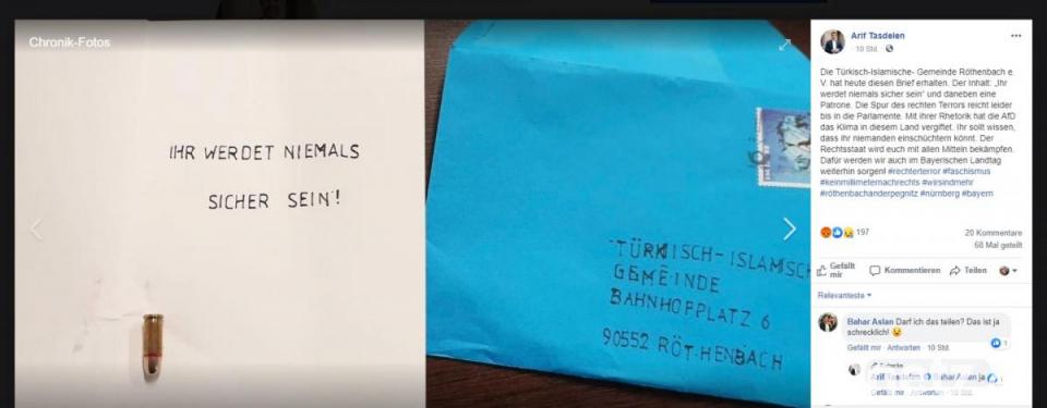Nachdem die Türkisch-Islamische Gemeinde Röthenbach einen Hassbrief mit den Worten "Ihr werdet niemals sicher sein" und beigefügter Patrone erhalten hat, hat die Allianz gegen Rechtsextremismus in der Metropolregion Nürnberg laut Meldung des BR Anzeige erstattet. Der Nürnberger Landtagsabgeordnete der SPD Arif Tasdelen verurteilt die Drohung auf seiner Facebookseite: "Die Spur des rechten Terrors reicht leider bis in die Parlamente. Mit ihrer Rhetorik hat die AfD das Klima in diesem Land vergiftet. Ihr sollt wissen, dass ihr niemanden einschüchtern könnt. Der Rechtsstaat wird euch mit allen Mitteln bekämpfen. Dafür werden wir auch im Bayerischen Landtag weiterhin sorgen!"