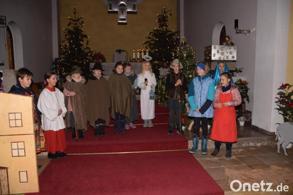 „Ihr Kinderlein kommet“ tönte es von der Orgel der Empore der Kirche St. Josef in Bechtsrieth, und die Kinderlein kamen. Als Maria und Josef, Engel und Hirten zogen die Darsteller des Krippenspiels an Heiligabend mit Pfarrer Thomas Stohldreier in die weihnachtlich wunderschön geschmückte Kirche ein. Die Kinder der dritten und vierten Grundschulklasse hatte die Szenen mit Andrea Leicht, Sonja Lehner und Alfred Wulfänger (Pfarrgemeinderat) einstudiert. Sina Bäumler, Jonathan Schwab und Lina Bausch, Elena Braun, Lina Frank, Emma Gallitzendorfer, Lisa Kick, Jonas und Luise Reintsch, Klara Schiller sowie Samira Stahl spielten am Altar die Geschichte von der Herbergssuche bis zur Geburt Jesus in der Krippe im Stall. "Liebe Buben und Mädln, wir bedanken uns für die Weihnachtsbotschaft, die ihr uns hier vor Augen geführt habt", sagte Pfarrer Stohldreier. Es gab jede Menge Applaus in der vollen Kirche.