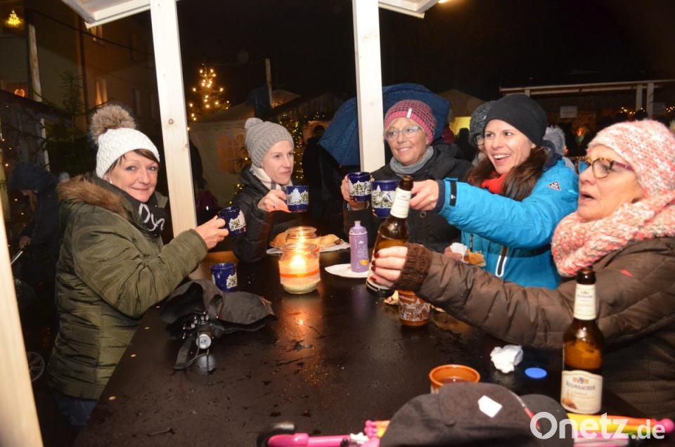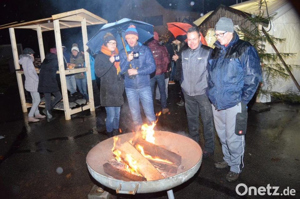 Trotz des Regens am frühen Abend kamen die Leute und ihnen gefiel es. "Auch wenn das Wetter schlecht ist, lassen wir unseren Weihnachtsmarkt nicht alleine", sagte Willi Würf. Petra und Martin Schmid waren aus Michldorf mit Freunden da und in bester Laune beim Glühwein. Auf dem Platz brannten Feuer in Eisenschalen, die Besucher sammelten sich um die Stehtischgarnituren.