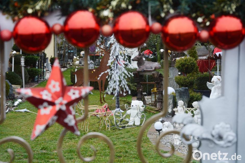 Die Weihnachtszeit beginnt für die Familie in der Sandstraße 10 eigentlich bereits Wochen zuvor. Dann holen die Seniorin und ihr Mann die vielen Kisten und Kartons - alle fein säuberlich beschriftet - aus dem Keller und beginnen mit dem Aufbau. Der sei mittlerweile ganz schön anstrengend geworden, aber "ohne" könne sie nicht sein. Bis unters Dach empfängt den Besucher ein weihnachtliches Wunderland. Jedes Dekostück scheint wohl plaziert. Beim Blick in den Garten das gleiche Szenario. Rasenfläche, Zaun und Bäume glitzern dicht behängt.