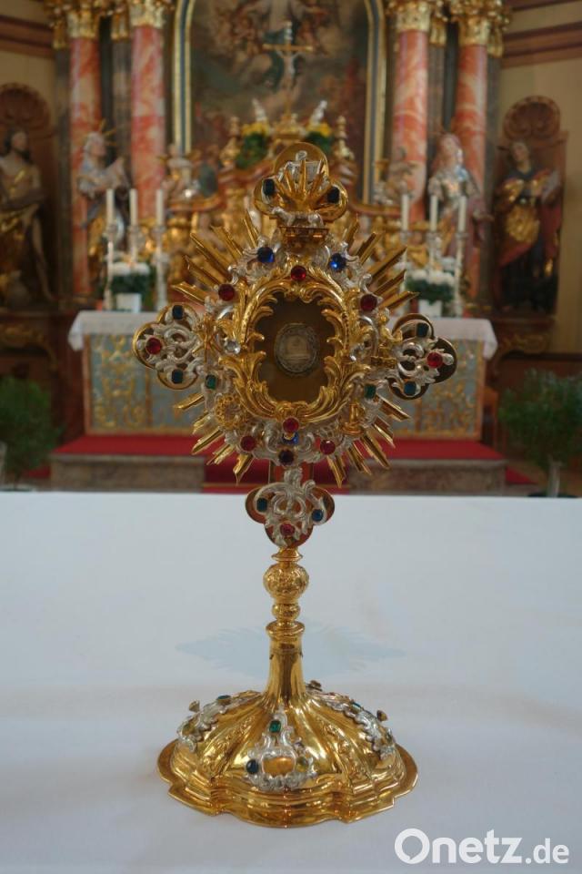 Am Schluss des Festgottesdienstes dankte Pfarrer Thomas Thiermann dem Festprediger für die ermutigende und aufbauende Predigt. Der Sprecher des Pfarrgemeinderates, Michael Vollath, überreichte eine kleines Präsent. Zum Abschluss erteilte Pfarrer Johann Zeltsperger den Segen mit der Reliqienmonstranz des Hl. Leonhard.