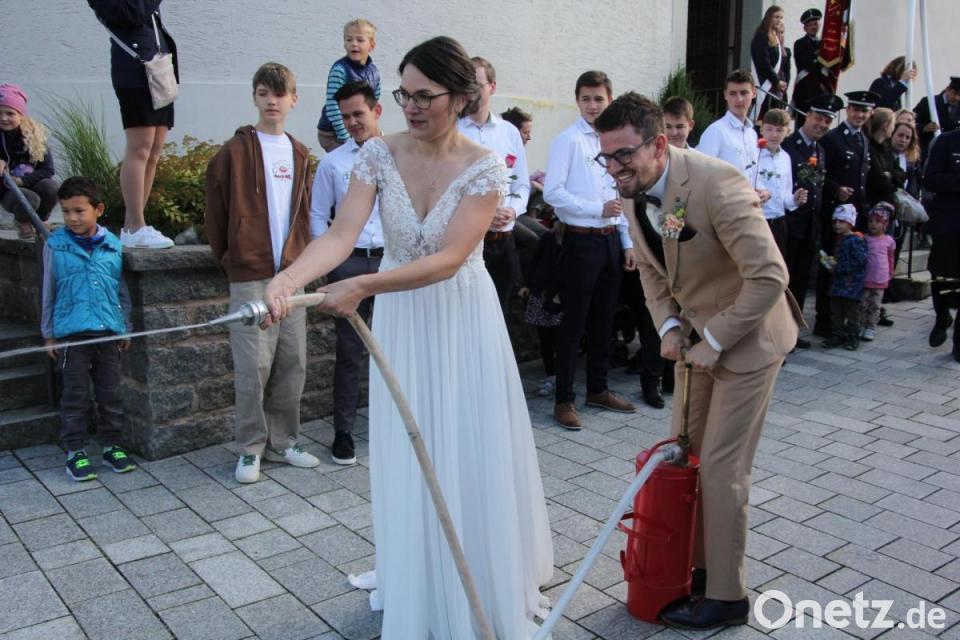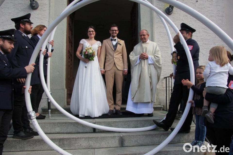 Den Bund der Ehe schlossen am vergangenen Samstag in der Pfarrkirche Mariä Himmelfahrt in Beidl die 29-jährige Sandra, geborene Weiß, und der 26-jährige Konstantin Franz aus Schönficht. Kennengelernt haben sich die Bürokauffrau aus Großbüchlberg und der Landmaschinenmechanikermeister 2014 bei ihrem gemeinsamen Arbeitgeber Landtechnik Malzer in Mitterteich. Die Trauung nahm Pfarrer Thomas Thiermann vor. Gesanglich wurde die kirchliche Hochzeit vom Chor "Grazie a Dio" umrahmt. Mit dabei war auch die gemeinsame 13 Monate alte Tochter Hermine. Das gemeinsame große Hobby der Frischvermählten ist die Feuerwehr. Nach der Trauung wurde das Paar deshalb von der Feuerwehr Schönficht - dort ist der Bräutigam Erster Kommandant-, der Feuerwehr Pechofen - die Braut ist bei der Wehr als Kassiererin aktiv - sowie den Kommandanten-Kollegen der Feuerwehren der Marktgemeinde Plößberg im Ehrenspalier erwartet. Natürlich musste das Brautpaar Teamwork an der Kübelspritze beweisen. Auch die KLJB Beidl gratulierte. Die anschließende Hochzeitsfeier fand im Gasthaus Miedl in Ilsenbach statt. Die Hochzeitsreise geht zum Großen Arber. Wohnen wird das Paar weiterhin in Schönficht.