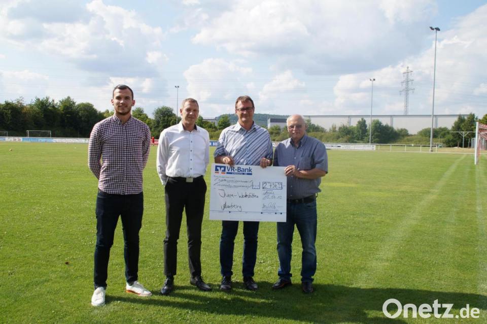 Bei der Partie zugunsten der Jura-Werkstätten war das Ergebnis jedoch Nebensache. Was zählte, war das Spendenaufkommen. Laut Albert Sejdiu (links), Kapitän des SV Inter Bergsteig, der das Spiel mit einigen Helfern organisiert hatte, kamen 2734,99 Euro zusammen. Den Scheck übergab Sejdiu am Montag im Beisein von Roland Franz (Zweiter von links), dem Betriebsleiter des Sponsors Fischer Automobile, und Inter-Vorsitzendem Georg Carlejan (rechts) an Bernhard Albrecht, den Geschäftsführer der Jura-Werkstätten.