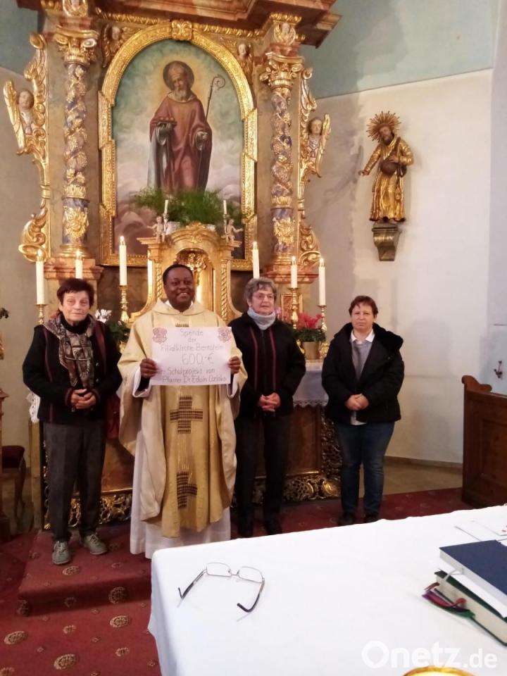Für das Schulprojekt von Pfarrer Edwin Ozioko spendeten Kirchenrat und Privatpersonen. Damit soll Kindern eine Schulausbildung ermöglicht werden. Pfarrer Edwin Ozioko unterstützt ein Schulprojekt in Nigeria. Dafür durfte er sich nun über ein Spende über 600 Euro mehrerer Geber freuen. Für die Filialkirche Bernstein überreichten Kirchenrätin Corinna Pfeiffer und Monika Richter eine Gabe von 300 Euro. Weitere 200 Euro erhielt er aus dem Verkauf von Kräutersträußen.